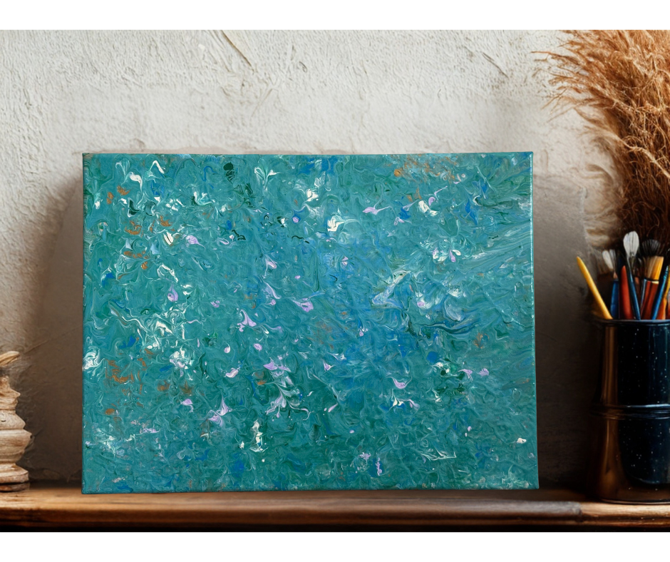 Blue Anemone explores the way colour gathers and disperses like light filtered through water. Layers of teal, sea-green, and soft blue unfold across the surface, interrupted by delicate gestures of lavender and white — like petals drifting in an unseen current.